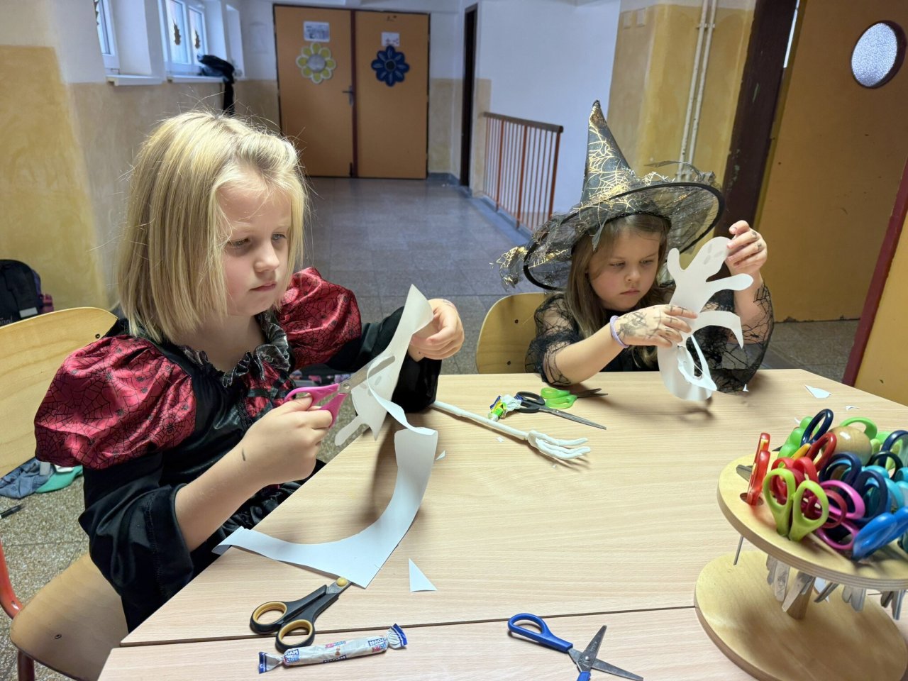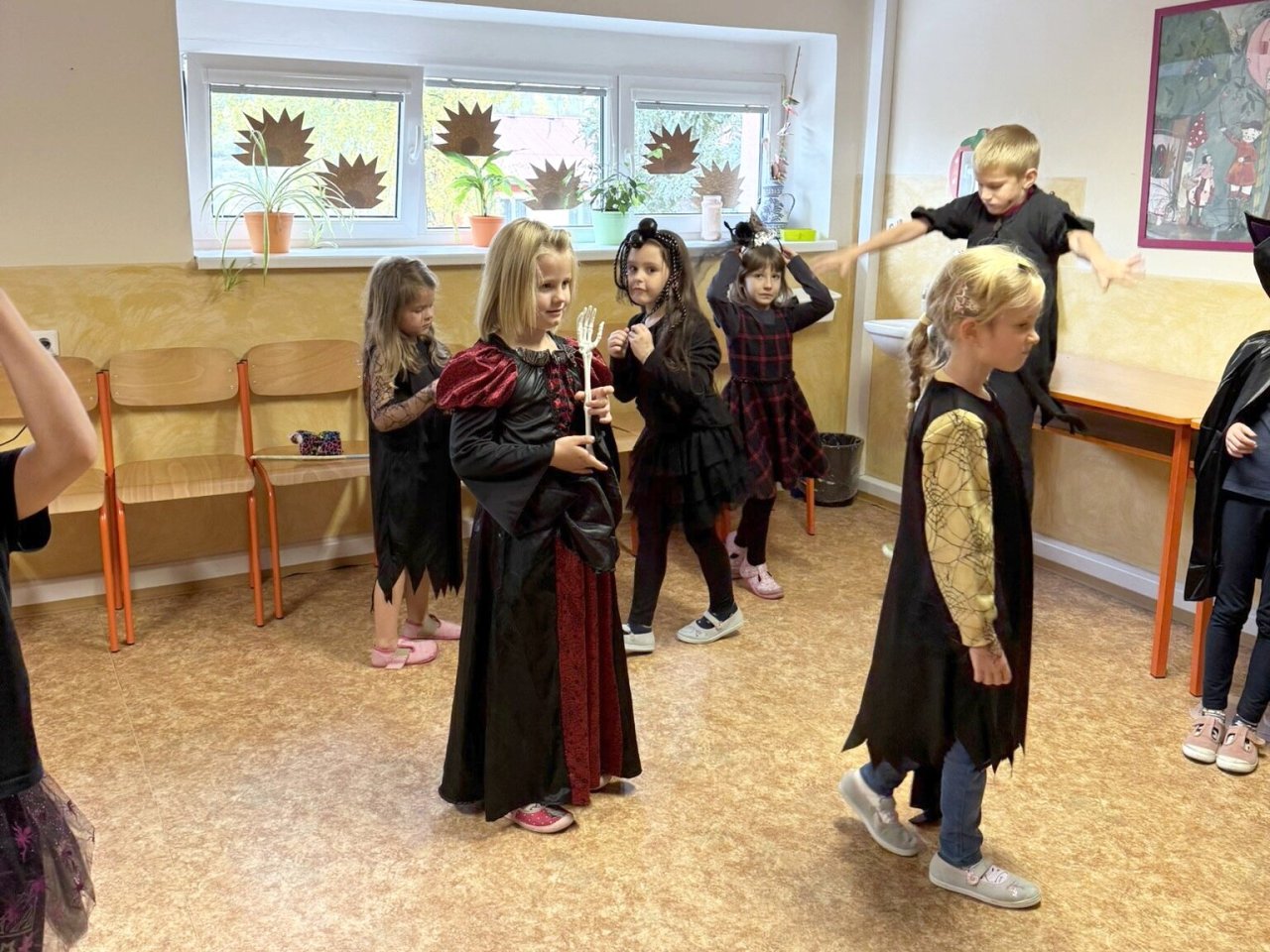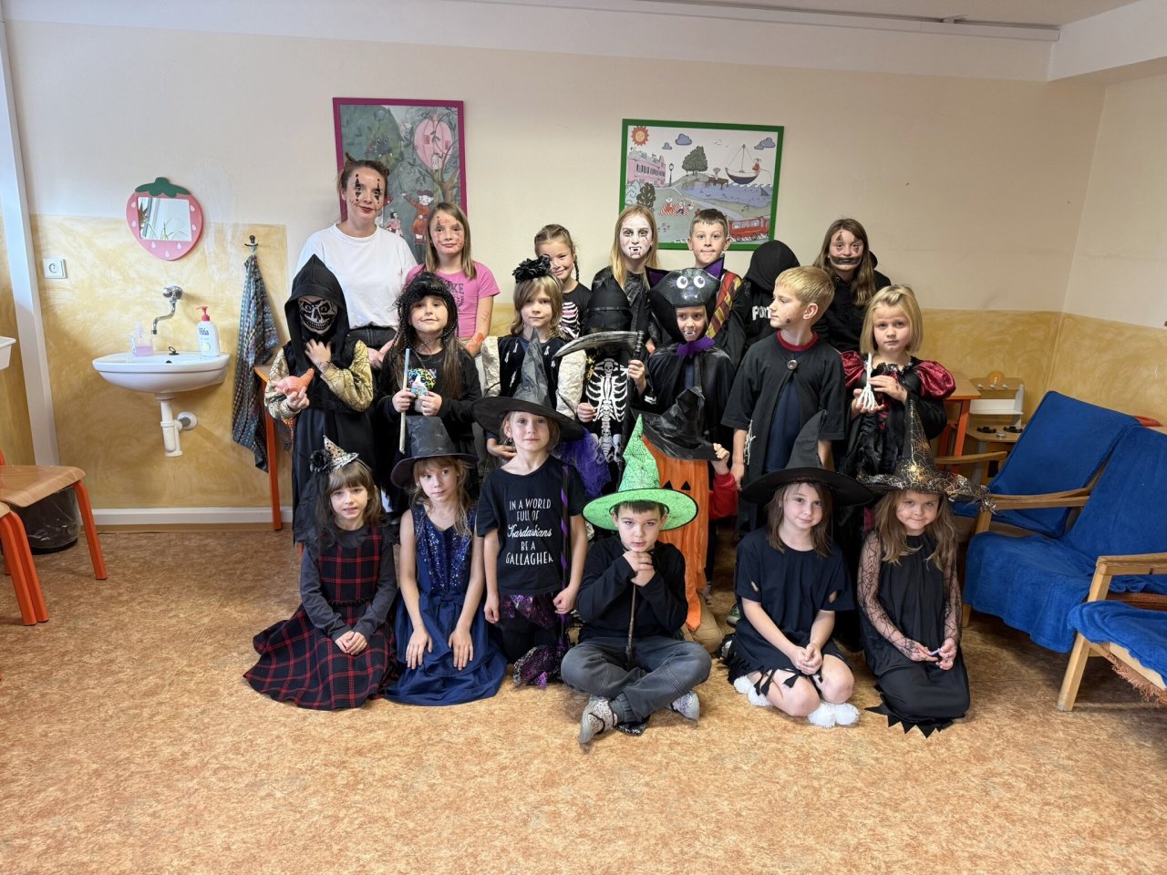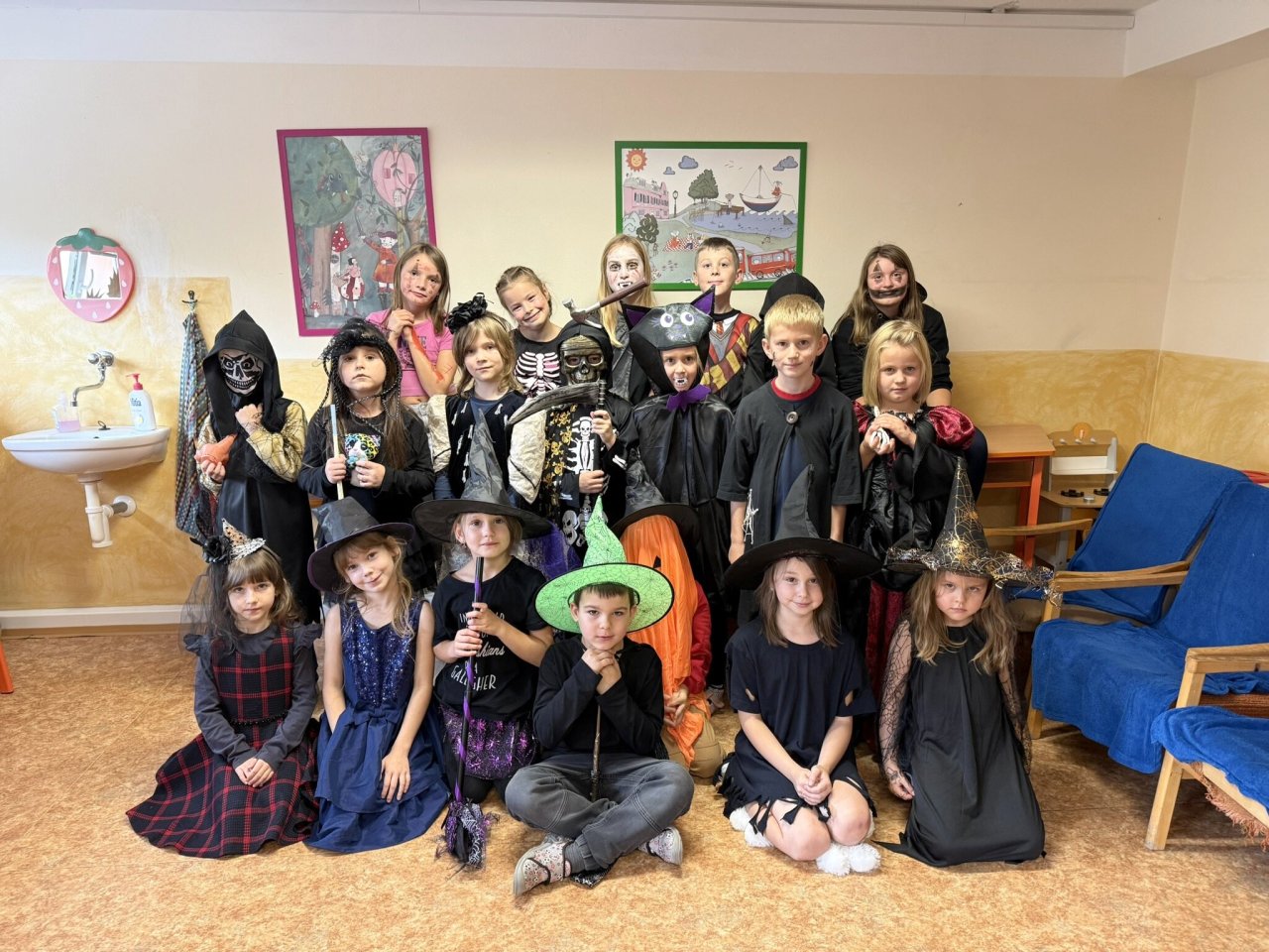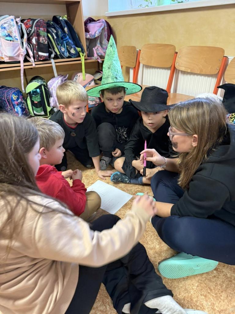 Páteční odpoledne před podzimními prázdninami bylo ve školní družině věnováno přípravám na „Helouwenský rej“. Chystal se „taneční sál“, kostýmy, masky, malé občerstvení, hry a soutěže. Ve třináct hodin vše vypuklo. Děti se společně sešly v prostorách I. oddělení ŠD. Nejdříve společné foto a pak už tu byla první série písniček k tanci. Tanec byl přerušován krátkými přestávkami, které byly věnované hrám a soutěžím. Tím posledním úkolem bylo vyluštit tajenku, kde se ukrývá poklad. Některým dala pěkně zabrat. Ale i tak se bystří luštitelé mezi dětmi našli a mohli se odebrat do míst, kde byl uložen poklad v podobě sladké odměny s helouwenskými motivy. Hry, soutěže a společný tanec byl doplněn výtvarnou dílničkou, kde si děti mohly za pomoci starších kamarádů vyrobit ducha. Touto cestou bychom chtěli poděkovat i maminkám, které pro děti přichystaly drobné občerstvení.