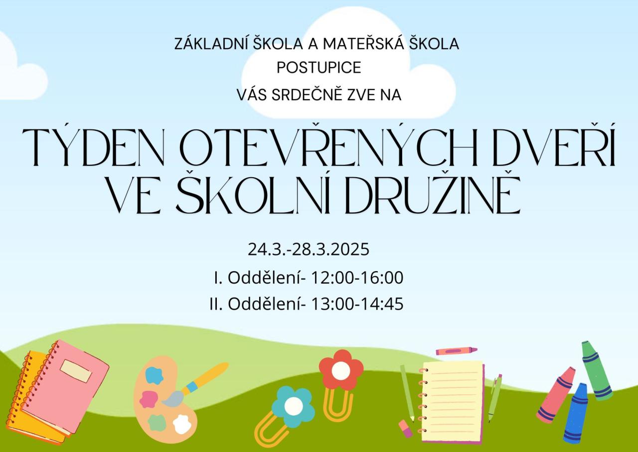 Tímto zveme všechny maminky, tatínky, rodiče i babičky do naší družinky. Přijďte si s námi, hrát, tvořit, občas i zlobit a povídat. Dveře naší družinky vám budou otevřeny v týdnu od pondělí 24. března do pátku 28. března v době: