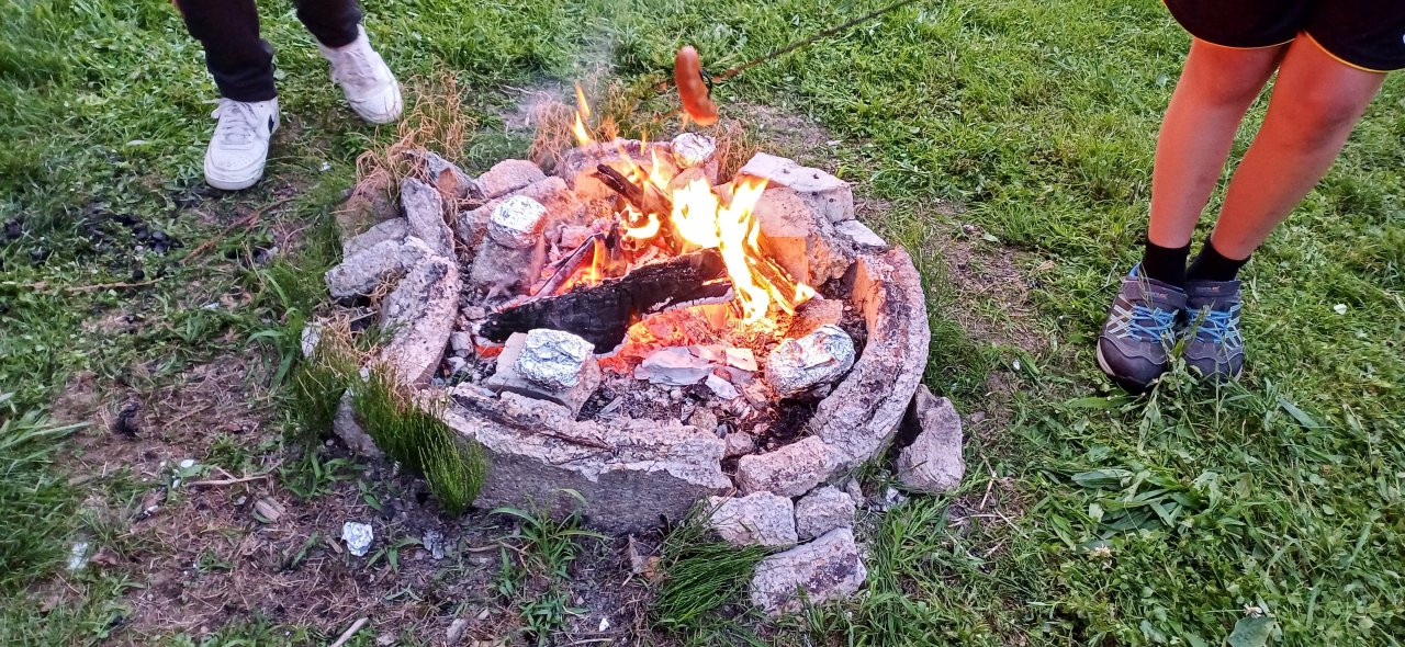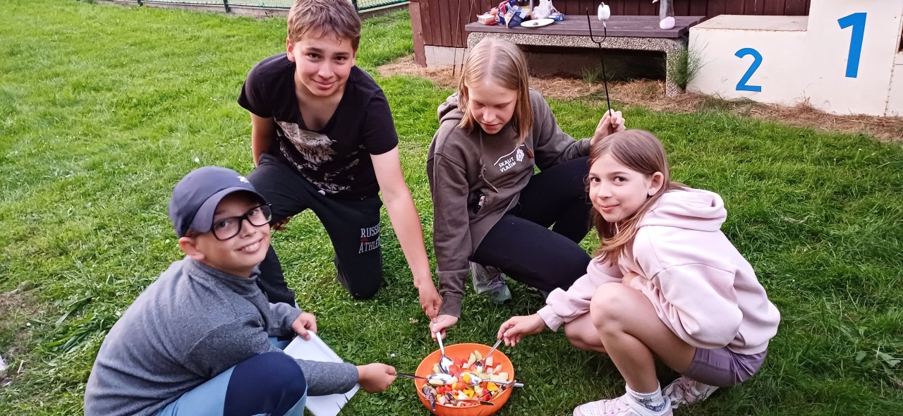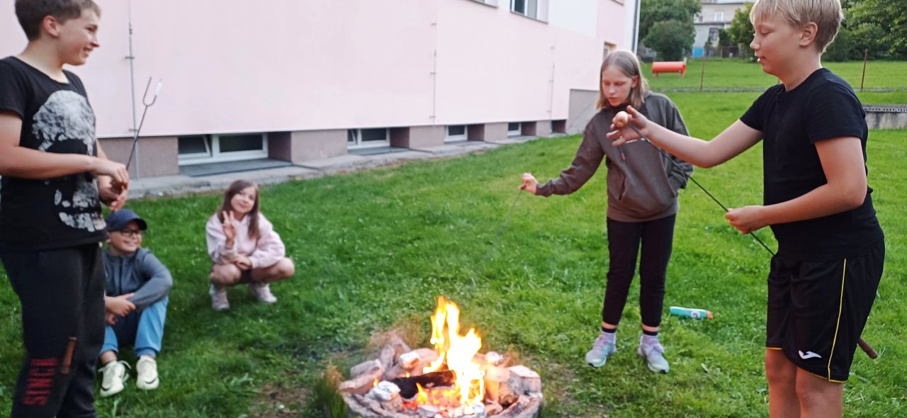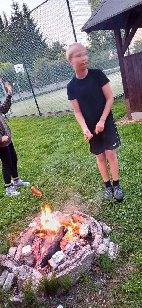 Po podvečerním návratu do školy nás čekala přespávačka v naší třídě. Večeři jsme si opekli na ohni za školou, na hřišti zahráli fotbálek. Po setmění jsme si užili báječnou hru pro odvážné - stezku odvahy chodbami temné školy.