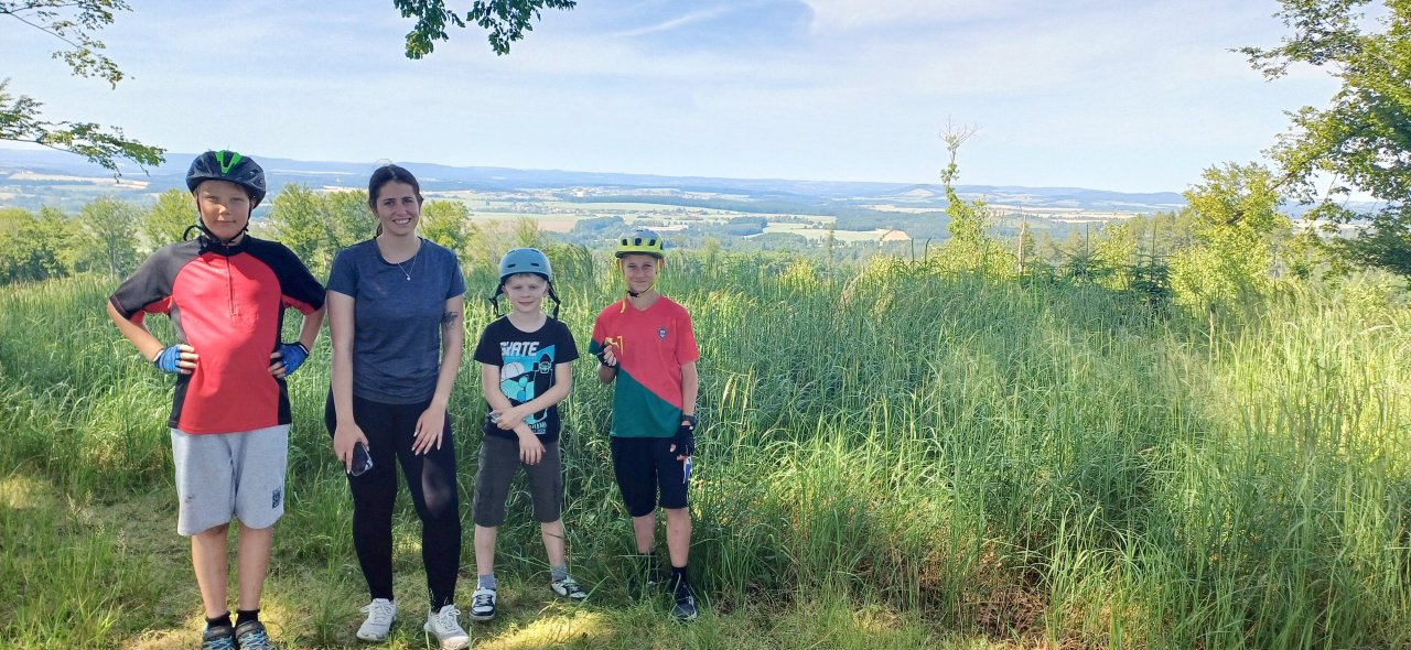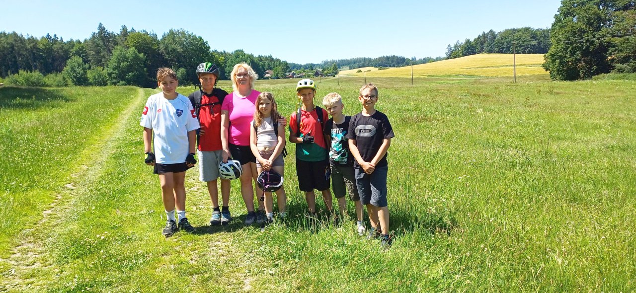 Na cyklistický výlet jsme zvolili trasu stinnými lesy, polními cestami a rozkvetlými loukami. Zastávky na koupání nesměly chybět, v Miroslavi jsme se posílili zmrzlinou a prohlédli si čerstvě vylíhnutého motýla.