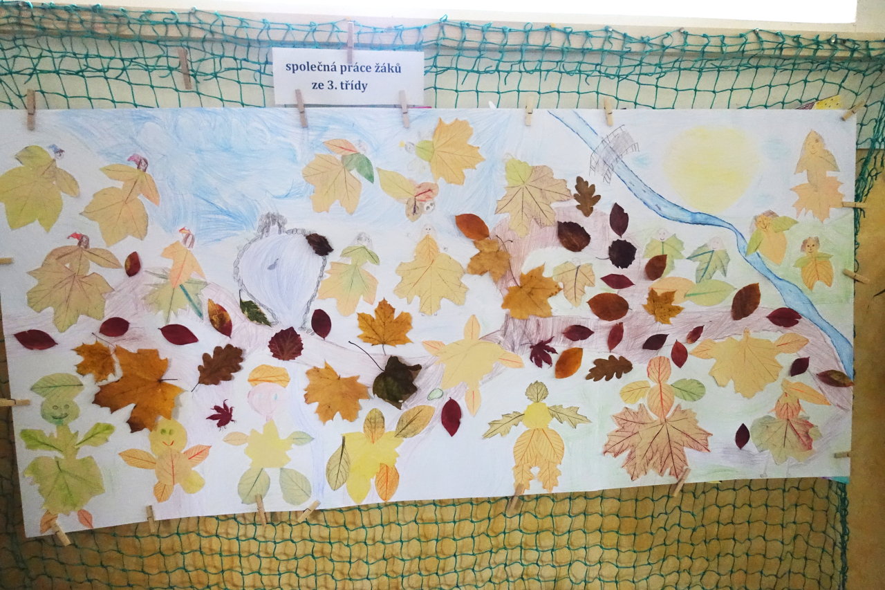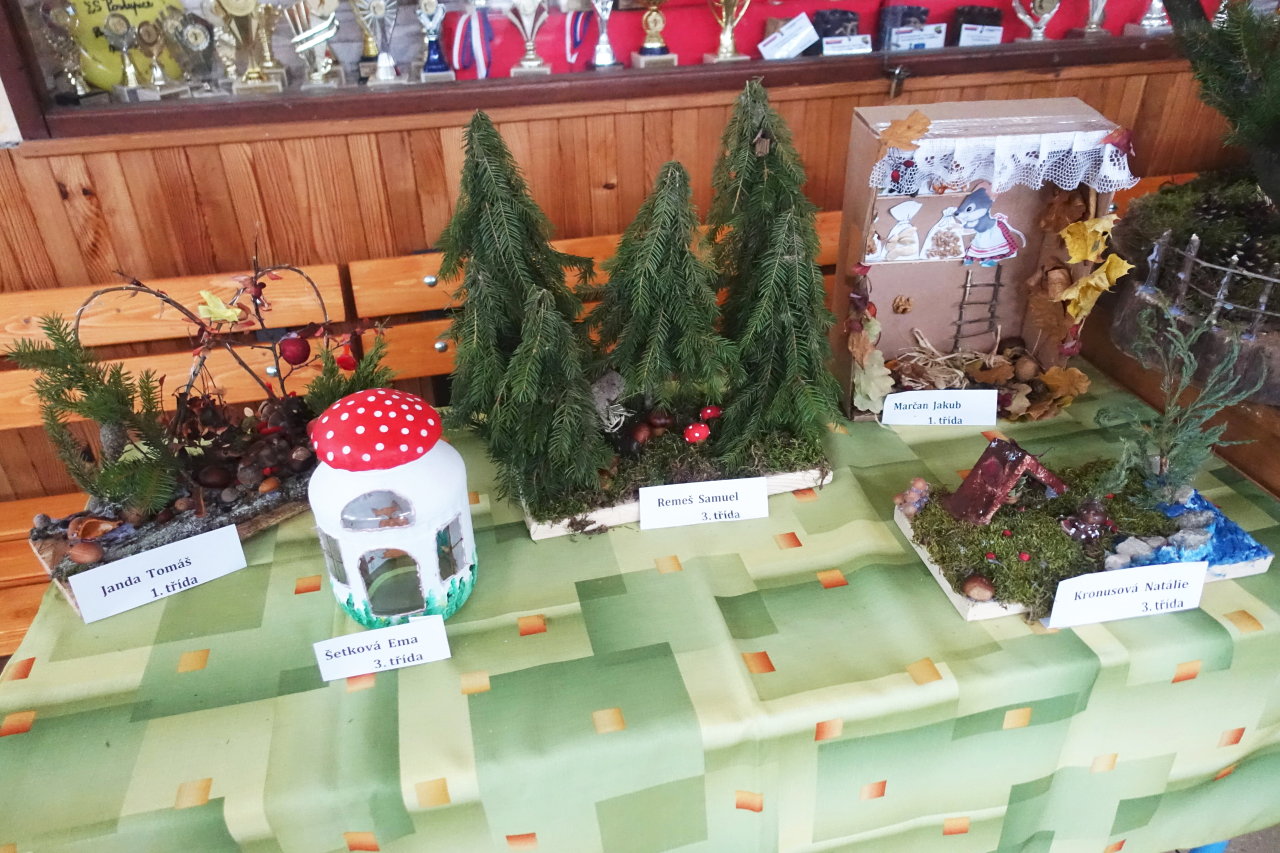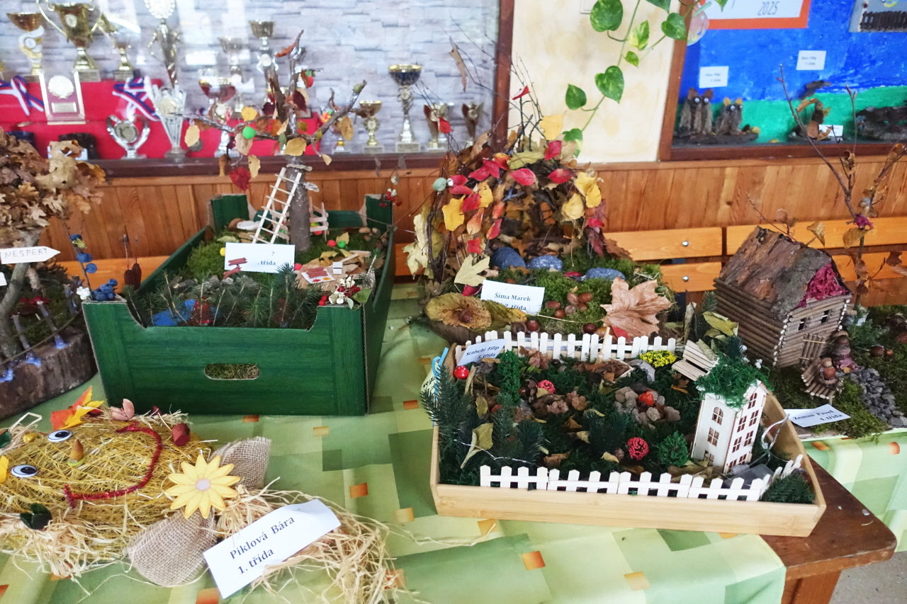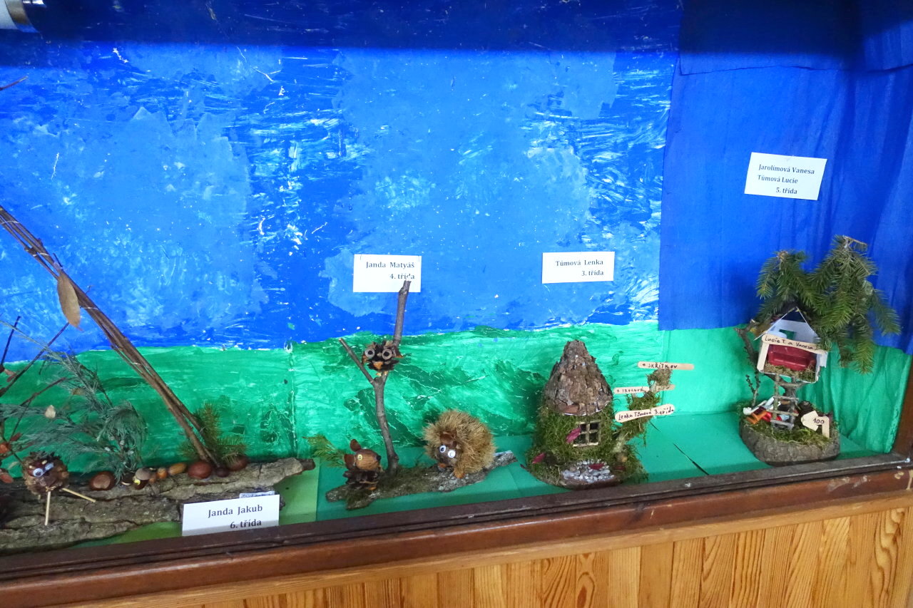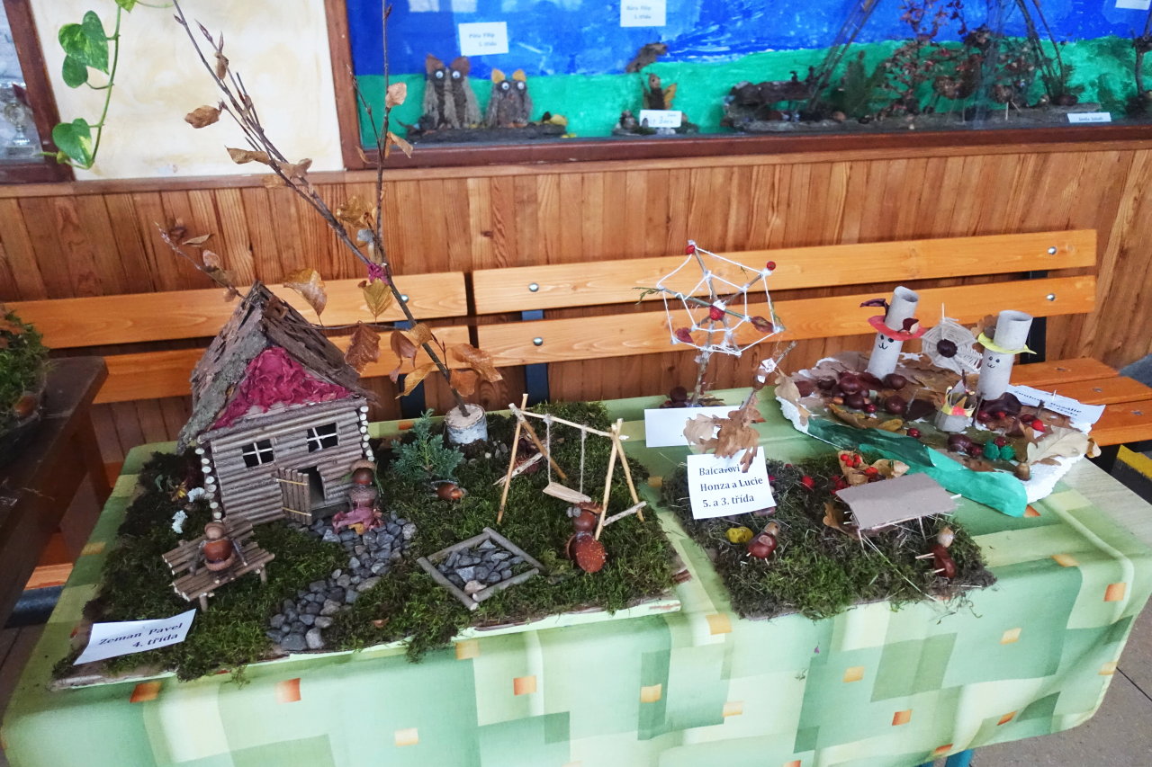 Do vestibulu školy jsme připravili výstavu výtvorů ze soutěže „Krásy podzimu“ – práce tvořily harmonii z přírodních materiálů a zářily podzimními barvami. Zvláštní uznání patří kreativním žákům 1. stupně – ukázali jste skvělou fantazii a je vidět, že při výrobě jste strávili mnohé příjemné chvíle se svými „dospěláky“ při realizaci tvůrčích nápadů. Pochvalu navíc si zaslouží kolektivní práce žáků třetí a čtvrté třídy. Pod vedením své paní učitelky třídní vytvořili čtvrťáci celou „ Lesní školu“ i s pěkným vybavením a třeťáci pak portréty skřítků, kteří do školy chodí.