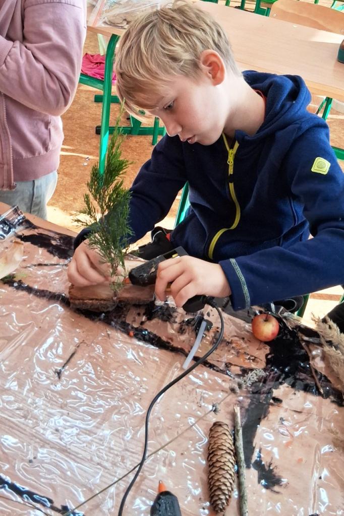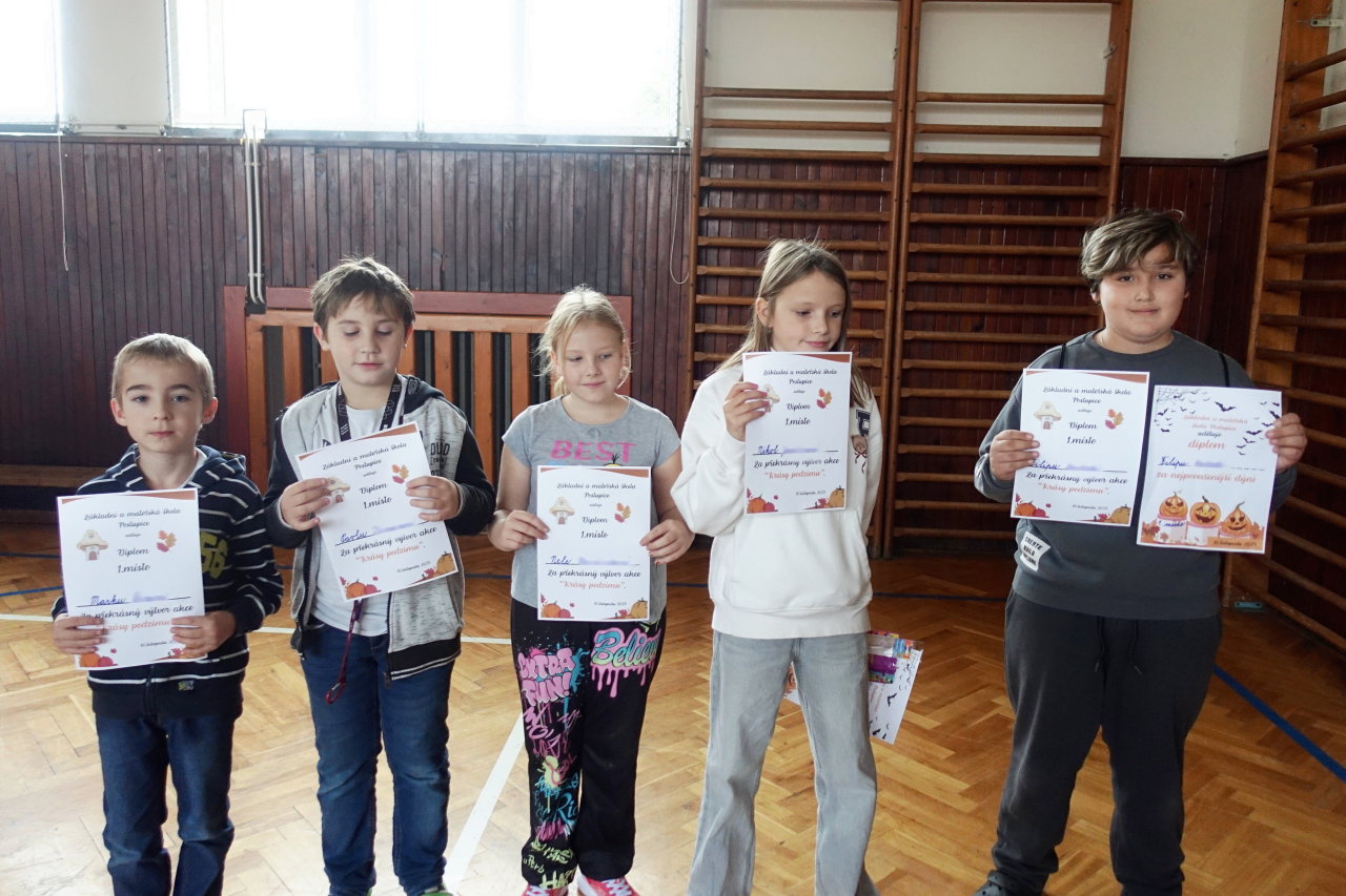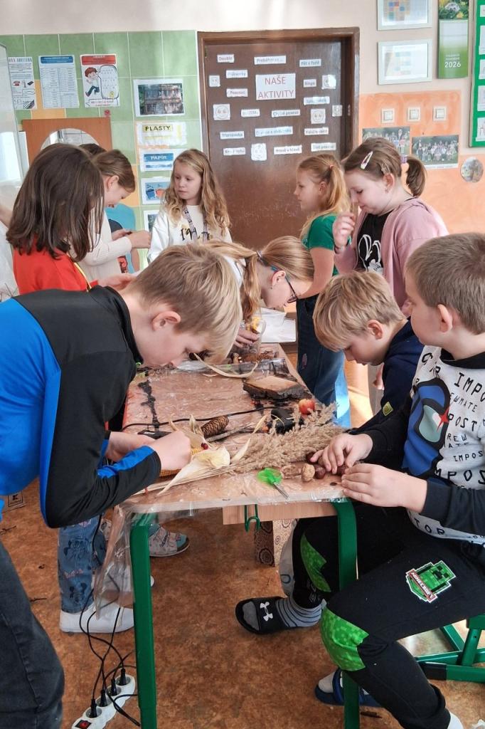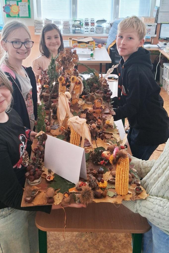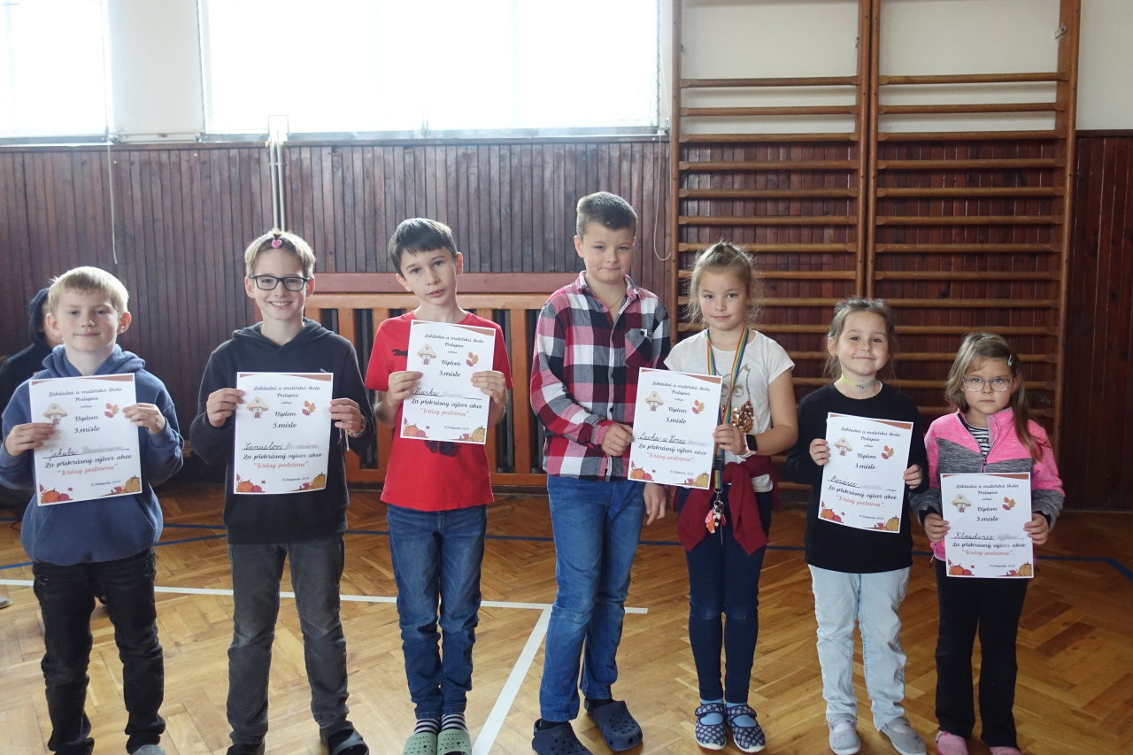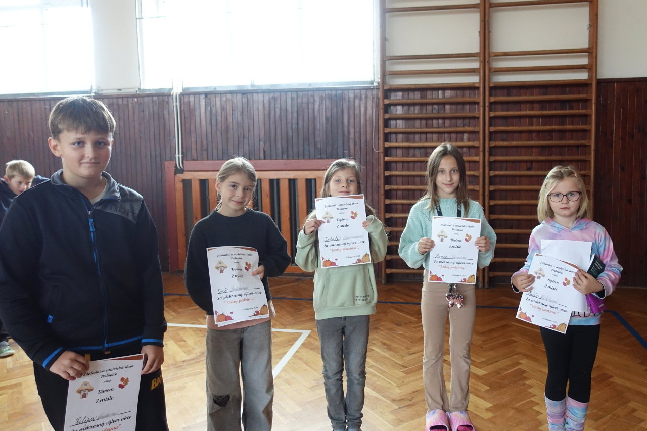 Do vestibulu školy jsme připravili výstavu výtvorů ze soutěže „Krásy podzimu“ – práce tvořily harmonii z přírodních materiálů a zářily podzimními barvami. Zvláštní uznání patří kreativním žákům 1. stupně – ukázali jste skvělou fantazii a je vidět, že při výrobě jste strávili mnohé příjemné chvíle se svými „dospěláky“ při realizaci tvůrčích nápadů. Pochvalu navíc si zaslouží kolektivní práce žáků třetí a čtvrté třídy. Pod vedením své paní učitelky třídní vytvořili čtvrťáci celou „ Lesní školu“ i s pěkným vybavením a třeťáci pak portréty skřítků, kteří do školy chodí.